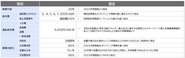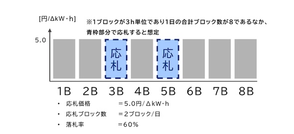 図3の例の場合、1日あたりの獲得収益は、5.0[円/ΔkW・h]×3[h/ブロック]×2[ブロック/日]×60%=18[円/ΔkW・日]と試算される。その他の主な試算条件は、表3のとおりである。