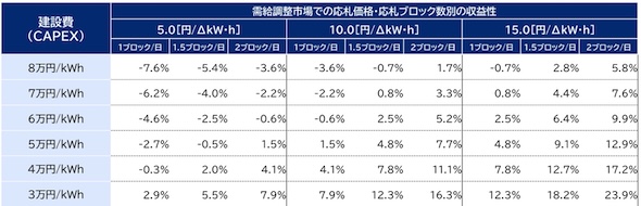 以上の前提条件を基に、系統用蓄電システムの需給調整市場における収益性評価を試算した結果が表4である。当然ながら、応札価格(=落札価格)が高いほど、建設費(CAPEX)が低いほど、良い収益性が期待できる。また、応札ブロック数を増やすと収益性は増加するが、商品区分によってはアセスメントIIについて不適合となるリスクがあることに留意が必要である。