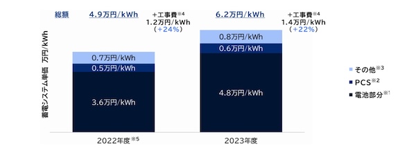 2023年度「系統用蓄電池等導入支援事業」等の採択案件の系統用蓄電システムのコスト(税等を除く)は6.2万円/kWhであり、海外製蓄電システムを採用する場合、コスト2〜4万円/kWhの案件も報告されており、条件次第では一定の収益性が期待される。