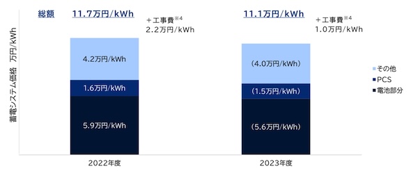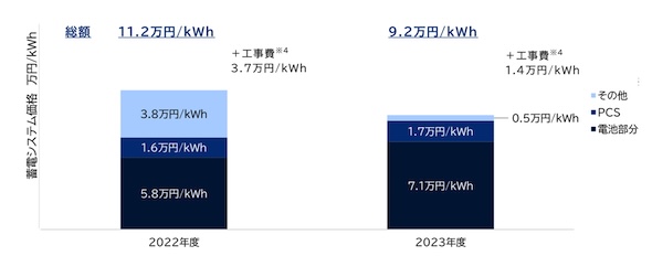 2023年度の業務・産業用蓄電システムのコストは9.2万円/kWhであり、前年と比べ2割程度低減したものの、電池部分の価格7.1万円/kWhは前年比で2割程度上昇している。これは系統用蓄電システムと同様に、資源価格の高騰や円安の影響と考えられる。