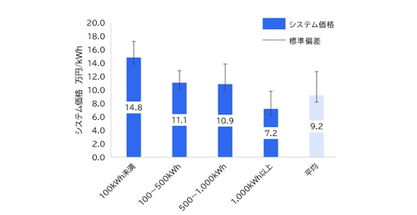 なお、業務・産業用のシステム価格(kWh単価)は容量規模による違いが大きく、容量区分が100kWh未満と1,000kWh以上のものでは、2倍以上の価格差が生じている。また、所轄消防により消防法への対応が異なり、消火・防火設備等により開発コストが高くなる場合があることが指摘されている。