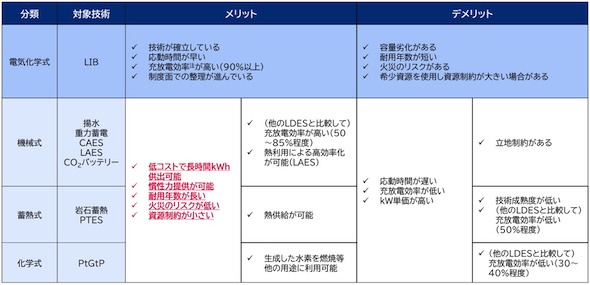 LDESは、主に電気化学式、機械式、蓄熱式、化学式に分類され、電気化学式の代表格であるLIBと比較すると、低コストでの長時間kWhの供出が可能、慣性力提供が可能、耐用年数が長い、資源制約が小さい、火災のリスクが低い等の長所を持つ技術が多い。