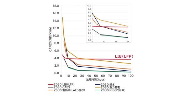 LDESは放電時間が長いことが最大の特徴であるが、これにより、放電時間が長くなるほどkWh当たりの資本費(CAPEX)が低下することになる。LIBも2030年には資本費が大きく低下すると想定されているが、長時間放電で比較すると、LDESの方が資本費が低くなる傾向は変わらないと考えられている。