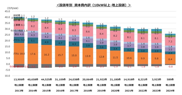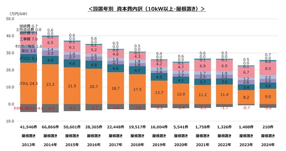また、工事費はこれまで明確な低減傾向が見られなかったが、2024年には10%程度の低減が確認された。これは、高圧・特高と比べてkWあたり工事費用平均値が近年割高であった低圧(10-50kW)の案件数・案件比率が減少したことが一因と考えられる。