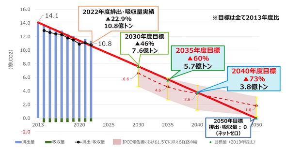 現行の「政府実行計画」(政府がその事務及び事業に関し温室効果ガスの排出の削減等のため実行すべき措置について定める計画)では、2030年度50%削減(2013年度比)を目標としているが、地球温暖化対策計画の見直しを踏まえ、2035年度に65%削減、2040年度に79%削減(いずれも2013年度比)の新たな目標を設定することとした。