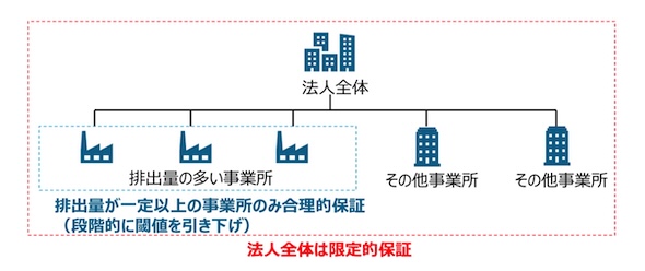 ただし、検証を行う第三者機関や制度対象事業者側での体制整備に一定の期間を要するため、当面は法人全体の排出量に対して一律に高い水準での保証を要求するのではなく、大規模な事業所と小規模な事業所では異なる保証水準を適用可能とすることなどを検討する。