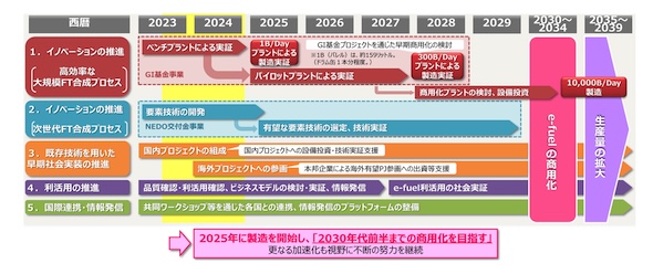 2023年6月に策定された「合成燃料(e-fuel)の商用化に向けたロードマップ」では、2025年に合成燃料の製造を開始し、2030年代前半までの商用化を目標としている。