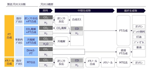 合成燃料の製造に用いられるプロセスとしては、「FT(フィッシャー・トロプシュ)合成」や「メタノール合成」が主なものとされ、FT合成はディーゼルやSAF等の相対的に重質な燃料製品の製造を得意とし、メタノール合成はメタノールやガソリン等の軽質な燃料製品の製造を得意とする特徴を持つ。