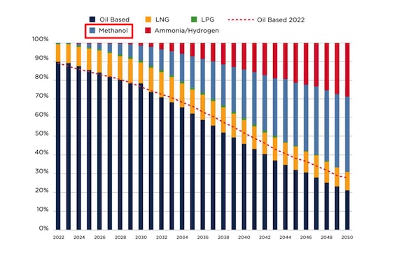 このため、世界的に従来の重油から、より低炭素な代替燃料船として、LNG燃料船やメタノール燃料船等への置き換えが進むと考えられている。メタノール(化石燃料由来)船の場合、重油と比べ、SOxは▲99%、NOxは▲80%、CO2は▲15%程度の削減効果が見込まれる。