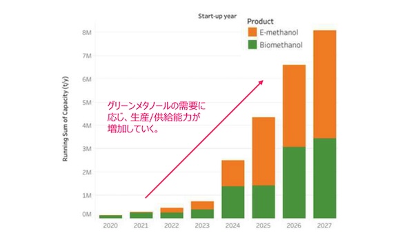 さらに化石燃料由来メタノールから、合成メタノールやバイオメタノールへの転換により、大幅なGHG排出削減が可能となり、世界的な生産能力は数年内に800万トン/年程度へ到達すると予測されている。もちろん、合成メタノール・バイオメタノールは必要に応じて改質を行い、SAFや合成ガソリンを製造することも可能である。