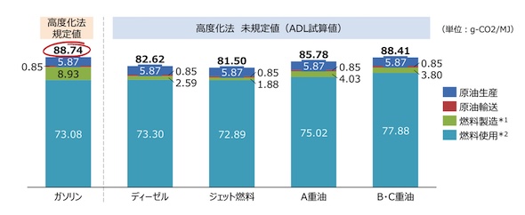 また、GHG排出量を比較すべき化石燃料(ベースライン)としては、液体化石燃料のうち最も需要量が大きいガソリンとする。すでにエネルギー供給構造高度化法においては、バイオエタノールのGHG排出量削減基準として、ガソリンのライフサイクルGHG排出量88.74g-CO2e/MJを使用しているため、合成燃料についてもこれを基準として使用する。なお、EUの基準値は94.0g-CO2e/MJである。