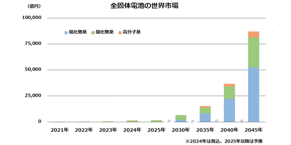 富士経済は2025年1月、全固体電池などの市場予測調査を公表。全固体電池の世界市場は、2045年までに足元の約300倍に相当する8.7兆円規模にまで拡大する見通しとしている。