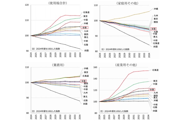 図4では、需要電力量(使用端)の増減(2024年度を100とした指数)をエリア別・部門別(需要区分別)に表している。