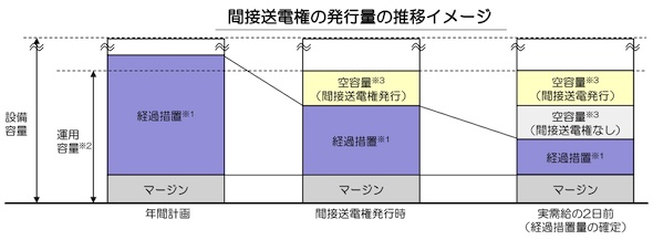 またJEPXが発行する間接送電権も、この混雑収入を原資としているため、JEPXに過度なリスクを負わせないため、その発行量は連系線の「空容量」を上限としている。ここで空容量とは、連系線の「運用容量」から「マージン」と「経過措置」計画量を差し引いた量を意味する。