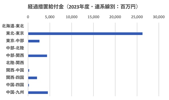 また経過措置数量とは、間接オークション導入前から先着優先ルールに基づき連系線を利用していた事業者に与えられた一種の優先枠である。経過措置対象事業者は、JEPXから事後的に経過措置給付金を受け取ることにより、実質的にエリア間値差リスクを負わないこととなる。これまで、経過措置対象事業者は32社、2023年度の総額は約405億円に上り、連系線別に見ると東北−東京間が最大の約263億円である。(経過措置量は非公開)