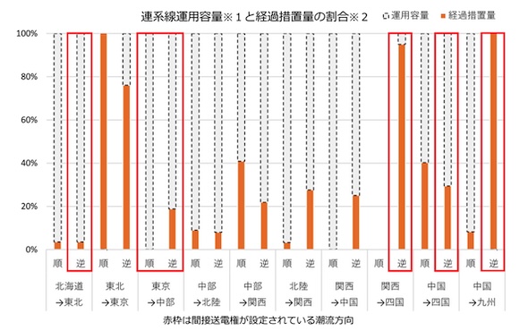 間接送電権が設定されている5連系線・6商品(潮流方向)のうち、関西−四国間(逆方向)と中国−九州間(逆方向)は、運用容量に対する経過措置量の割合が特に高い状況にある。多くの連系線・潮流方向において経過措置が適用されており、経過措置終了後は値差の影響を受けるエリア間取引が増加することにより、間接送電権の取引量が増加すると考えられる。