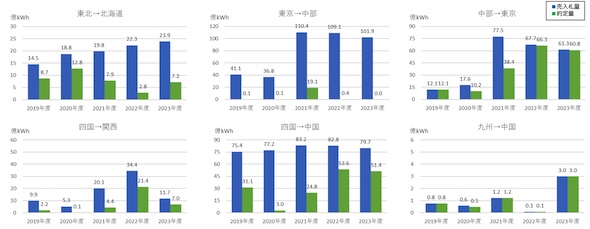 間接送電権を開始した2019年度以降の売入札量と約定量は、図5のとおりである。JEPXによる間接送電権の発行量=売入札量は、地域間連系線の運用容量や経過措置量の違いを反映して連系線により異なるが、その約定率も連系線により大きく異なる。