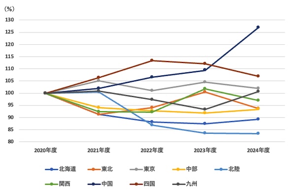 この表3の最右列にある2020年度から2024年度への増減率(2020年度を100とした変化率)を示したものが図1である。起点となる2020年度に特殊事情があった可能性もあるが、北陸エリアでは減少傾向が続いている。