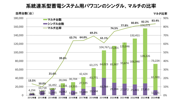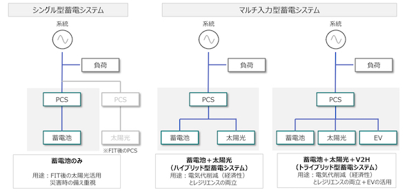 家庭用蓄電システムには、蓄電池とパワーコンディショナー(PCS)で構成した「シングル型蓄電システム」と、太陽光発電やEV等を組み合わせた「マルチ入力型蓄電システム」の2つのタイプがあり、近年では図1のように、8割以上がマルチ入力型となっている。