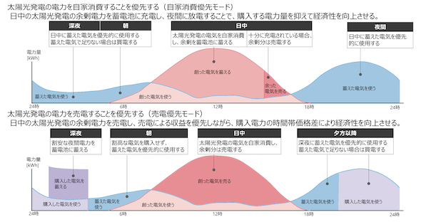 太陽光発電を併設するマルチ入力型の場合、家庭用蓄電システムの運転モードは、太陽光発電の電力を自家消費することを優先する「自家消費優先モード」と、太陽光発電の電力を売電することを優先する「売電優先モード」に大別される。
