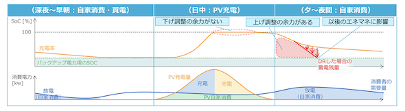 まず図7の晴天の日中には、PV余剰電力の充電により満充電状態となるため、さらなる充電による「上げDR」は出来ないと考えられる。他方、このような昼間やそれ以降の時間帯では、放電による「下げDR」を行える可能性が高い。ただし、逆潮流を行うには家庭用蓄電システムがこの機能を具備する必要がある。