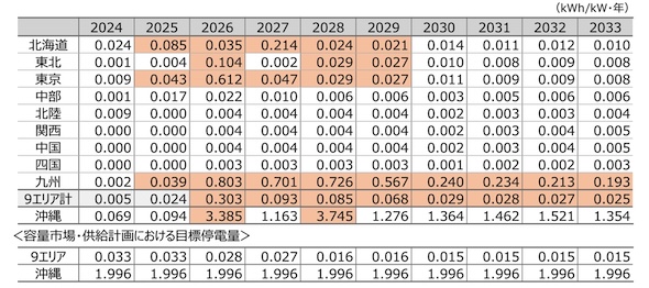 2024年度供給計画取りまとめにおいて、供給信頼度を年間EUE(Expected Unserved Energy=停電が発生する量を確率論的に評価する指標)とで評価した結果(表1)、北海道〜東京では、2025年度以降の複数の年度において供給信頼度基準(目標停電量)を超過しており、九州エリアでは2025年度以降、継続的に目標停電量を超過することが報告されている。
