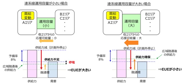 EUE評価においては、Aエリアで需給変動(供給力低下・需要増加)により停電するおそれがある場合には、他エリアから供給力を融通することとしている。この際に連系線の運用容量が小さいと融通できる量が少なくなるため、同じ予備率であったとしても停電量の期待値、つまりEUEは大きくなる。
