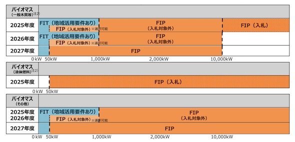 FIP制度開始以降、再エネ電源の早期の電力市場統合を促す観点から、FIP制度のみの適用を認める対象区分が段階的に拡大されてきた。現在バイオマス発電については、50〜1,000kW未満はFITかFIPを選択可能であり、1,000kW以上はFIPのみが適用可能である(ただし、バイオマス液体燃料は全規模FIPのみ)。