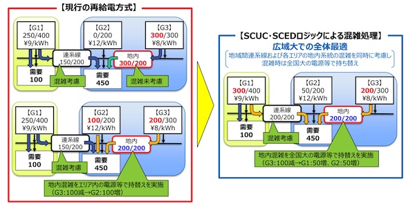 同時市場では、SCUC(Security Constrained Unit Commitment)及びSCED(Security Constrained Economic Dispatch)により、あらかじめ系統制約等を考慮した上で、電源の起動停止計画(UC)や最も経済的な出力配分(ED)を行うことが可能となる。
