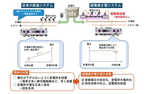変電所から車両に送電する場合、き電線の電気抵抗によってエネルギーロスが生じるため、車両の受電電圧が低下しないよう、変電所を密に配置する必要がある。鉄道総合技術研究所はこうした車両運用におけるエネルギーロスの削減に向けて、超電導を活用したシステムの開発と実証を進めてきた。