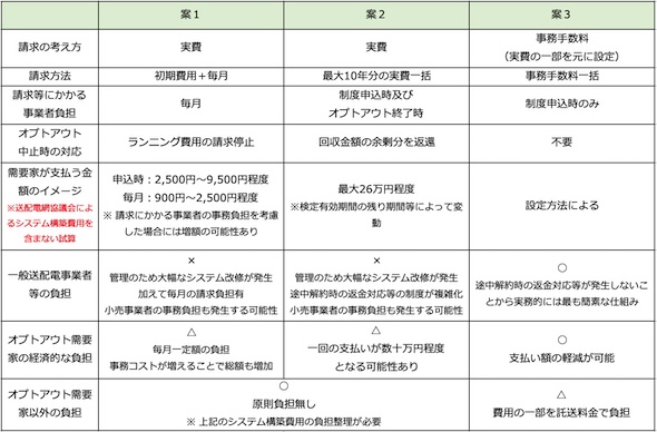 ただし案1・案2いずれであっても、一般送配電事業者等のシステム改修等に膨大なコストが発生し、オプトアウトした需要家に求める負担額も大きくなることが想定される。(表5の金額は、システム構築費用を含まない試算)。また、案1では毎月の請求業務、案2では途中解約時等の返金など、いずれも制度実務が煩雑になり、一般送配電事業者や小売電気事業者の負担も大きいと考えられる。