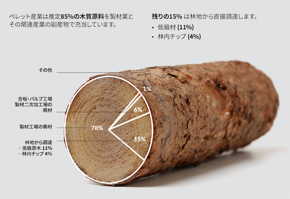この0.2%という割合は、木質ペレット用途のみならず、あらゆる製品や材料のために伐採した森林面積の合計となっている。同国の木質ペレットは、この0.2%相当の原木を製材工場で加工した後の廃材や、林地残材から製造されているのだ。具体的には原材料の85%を製材工場などで排出される廃材から、残りの15%は小枝や火災損傷材などを利用している。つまりバイオマス燃料のためだけに、中・上級の木が伐採されることは一切ないというわけだ。
