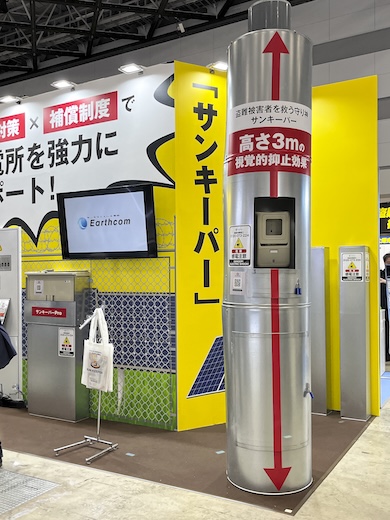 アースコム(埼玉県越谷市)は、狙われやすいケーブルの引込柱を、金属製のカバーで完全に覆ってしまうことを提案する。これを実現する製品として、強固な特殊鋼板でつくられた高さ3mの円柱状カバー「サンキーパー」を展示した。物理的な防護力に優れているだけでなく、窃盗犯に「この発電所は狙えない」と強く印象づける“視覚的抑止効果”も大きいという。