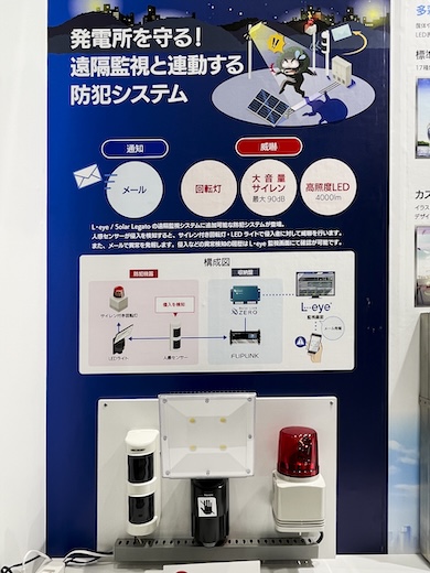 ラプラス・システム(京都市)は、同社の遠隔監視システム(L・eye/Solaer Legato)に追加可能な防犯オプションをアピールした。防犯機器(人感センサー/LEDライト/サイレン付き回転灯)を併せて設置することで、遠隔監視システムをケーブル盗難対策にも生かせるようになる。人感センサーが侵入を検知すると、サイレン付き回転灯やLEDライトで侵入者を威嚇(いかく)するとともに、メールで異常を通知する。異常検知の履歴は、L・eye/Solaer Legatoの監視画面で確認することができる。