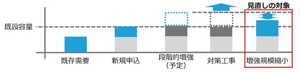 この対策としては、実態の伴わない系統容量確保分については、一般送配電事業者によって解放出来る仕組みを設けることや、系統増強工事の施工開始後に自社需要計画の下方修正や送電開始日を延期した大規模需要家に対して、計画の変更に伴う追加の費用負担を請求する仕組みを設けることなどが考えられる。