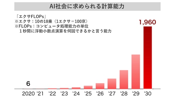 2030年、AI同士が自律的に協働し最適化する社会において、国内で必要とされる計算能力は、2020年と比べ300倍以上の1,960エクサFLOPs(1エクサ=100京)に増加すると試算されている。