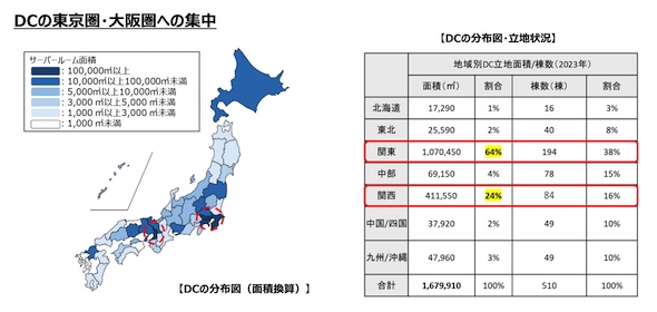 ただし現時点、データセンター(DC)は全国にまんべんなく立地するのではなく、その9割が大規模需要地である首都圏と大阪圏に集中している。また、国際通信の海底ケーブル陸揚局は、約5割が関東(房総半島及び北茨城)、約3割が関西(志摩半島)に集中している。