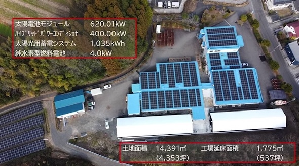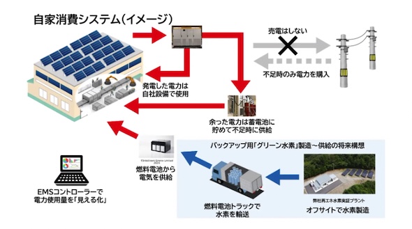 同工場には出力約620kWの太陽光発電システム、容量1035kWhのリチウムイオン蓄電池を併設。さらに万が一のエネルギー不足に備え、出力4.0kWの純水素型燃料電池をバックアップ電源として導入した。これらのシステムおよび工場の電力使用量などは、エネルギーマネジメントシステムで統合管理を行う仕組みだ。