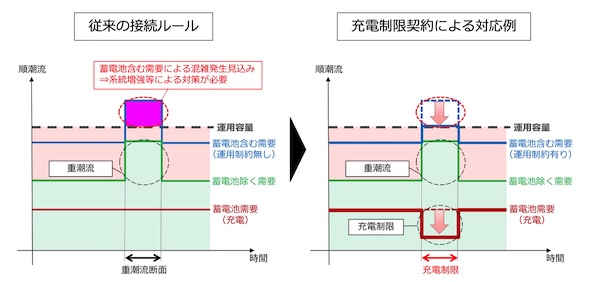 電源におけるノンファーム型接続に倣い、蓄電池でも混雑時間帯の充電を制限することにより、系統の運用容量の超過を避け、既存の系統容量を有効活用することが可能となる。