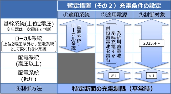 よって一般送配電事業者各社は、充電条件を設定することによる蓄電池の早期連系暫定措置を、2025年4月から開始した。蓄電池設置事業者は、一般送配電事業者が設定する充電条件(平常時の充電を制限する時間帯・上限値等)に同意することで、混雑しない時間帯の容量を活用して接続することが可能となる。