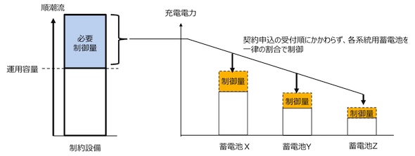 他方、先述の全国の「充電制限暫定措置」はオフライン制御であるため、細やかな制御が出来ない。このため、同一系統に複数の蓄電池が連系する場合、後着蓄電池の連系を理由とした先着蓄電池の充電条件変更は行わない。
