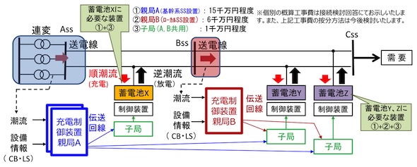 図9の場合、蓄電池Xの設置事業者は「親局A+子局」の工事費、蓄電池Y及びZは「親局A+親局B+子局」の工事費を負担する必要があり、現時点の工事費は、親局A(基幹系変電所設置)は15千万円程度、親局B(ローカル変電所設置)は6千万円程度、子局は1千万円程度である。
