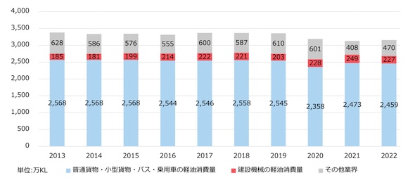主に貨物車等の大型車両で使用されるディーゼル燃料(軽油)は、2022年度の国内消費量は3,156万kL程度と推計されているが、現在、軽油についてはバイオ燃料の導入義務はなく、一部の事業者による自主的な利用に留まっている。