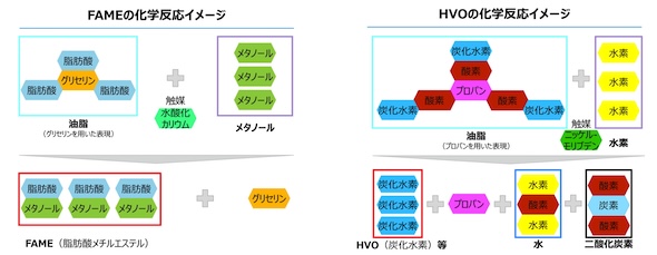バイオディーゼル(Bio Diesel Fuel:BDF)の技術は古くからあり、主に廃食油を原料としてメチルエステル化処理によって製造する「FAME(Fatty Acid Methyl Ester:脂肪酸メチルエステル)」が広く利用されてきた(図2左)。