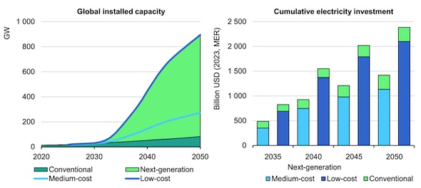 世界の地熱発電(従来型)の設備容量は、2023年時点で約15GWと推計されている。次世代型地熱技術に対する期待は世界でも高まっており、国際エネルギー機関(IEA)のレポート「The Future of Geothermal」によると、低コストシナリオにおける次世代型地熱発電の設備容量は、2035年に120GW、2050年には800GWを超えると見込まれている。これを実現するために必要となる世界の累積投資額は、2035年までに7,000億USD、2050年までに2.1兆USDと試算されている。