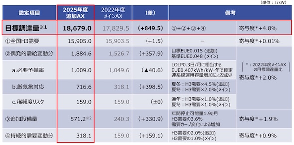 これらの結果、2025年度追加オークションの目標調達量は2022年度メインオークションから849.5万kW(4.8%)増加し、1億8,679万kWとなった。