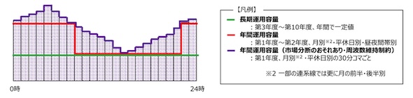 これまで容量市場の供給信頼度評価では、地域間連系線の「年間運用容量(図2の赤線)」を採用してきたが、今後は30分毎に細分化し、拡大した運用容量(図2の紫線)を適用するよう変更している。