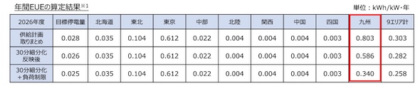 これら2つの運用容量拡大策により、供給力の広域融通が可能な範囲が拡がり、特に九州エリアでは年間EUEが大きく減少する(改善する)効果が得られている。これが先述の表2で、「必要予備率」の減少として現れている。