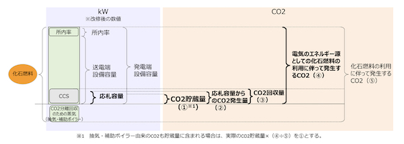 なお、水素・アンモニアでは技術的な課題等を踏まえ、専焼だけでなく「混焼」(水素:10%、アンモニア:20%)から開始することを認めている。既設火力を改修してCCS化する場合、敷地条件によりCO2分離回収設備等のCCS化に必要な設備の設置に制約が生じる場合があるため、最低CO2回収率として「20%」以上を求め、他の火力電源と同様に、2050年に向けた脱炭素化ロードマップの提出及びその実現への取り組みを求めることとする。「CO2回収率」とは、図1の「③÷④(定格出力時ベース)」により算出される。