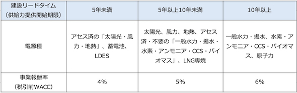 よって、第3回入札では事業報酬率5%をベースとして、建設リードタイムが10年以上の案件はリスクプレミアムとして事業報酬率を1%加算できることとし、5年未満の短い案件は1%減じることとした。なお本制度では、リクワイアメントとして設けている「供給力提供開始期限」を建設リードタイムと見なすこととする。